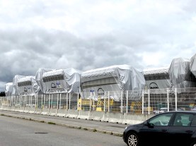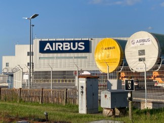 [Des tronçons d’Airbus fabriqués à Montoir. Photographie P. Madiot.]