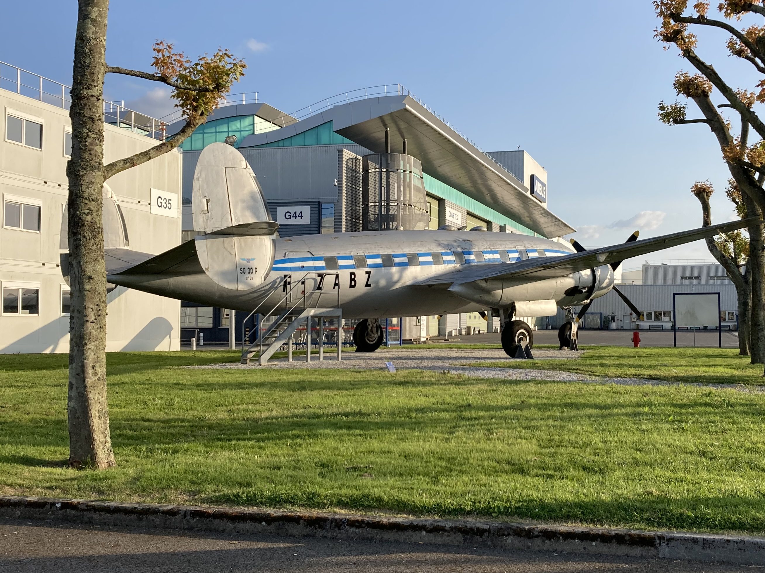 [Devant le siège de l’usine de Montoir, le « SO-30P Bretagne », un moyen courrier de 1947. Photographie P. Madiot.]